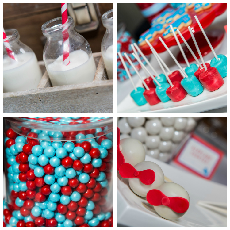 Other Airplane Baby Shower food ideas from Hermela includes milk bottles, propellor cake pops, and red and blue candy.